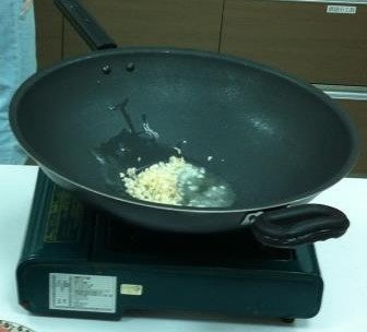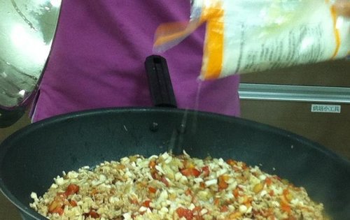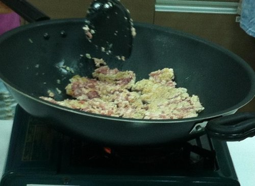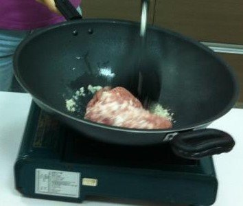 2) 起油鍋爆香薑末,在放絞肉下去炒。