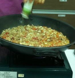 5) 在將所有的菇類一起放入鍋內,在加入蕃茄醬(糊)、調味料,一起拌炒。